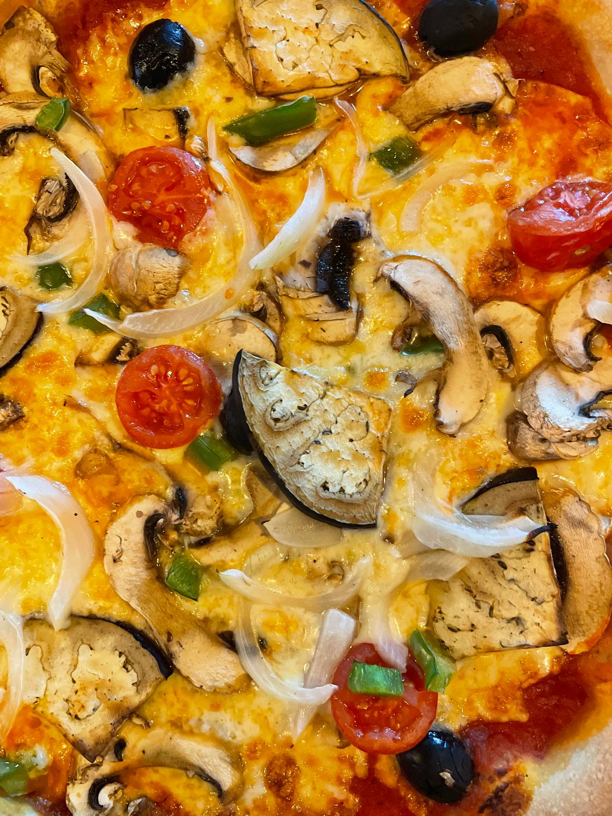 Pimiento verde, berenjena, cebolla, champiñones, tomate cherry , aceitunas negras.