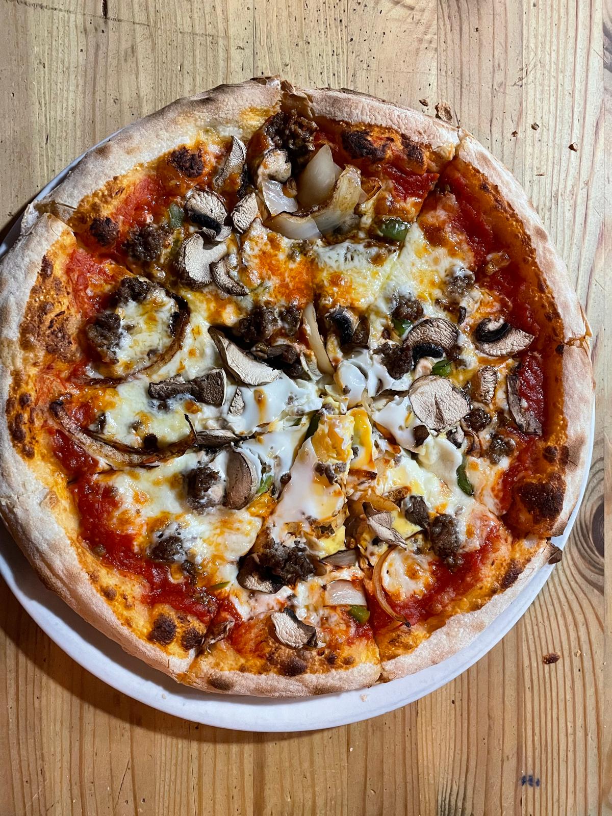 Bacon, peperoni, champiñones, roquefort , nata, cebolla, pimiento y berenjena.