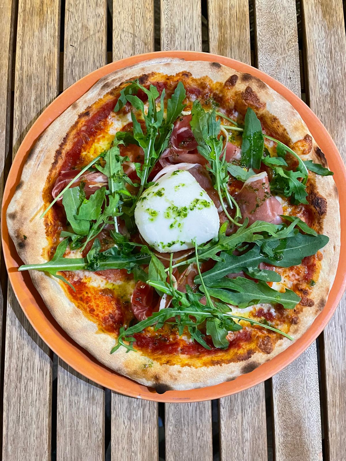 Base de tomate y queso, cherrys, jamón ibérico, burrata en el centro, pesto y topping de rúcula.